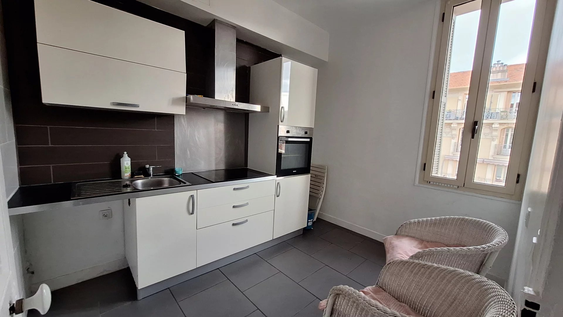 Gare Riquier, dans un bel immeuble ancien en parfait état, beau 3 pièces en étage élevé avec ascenseur comprenant un hall, un salon, deux chambres, une cuisine aménagée, une salle de bains, un WC indépendant, un balcon et une cave.
